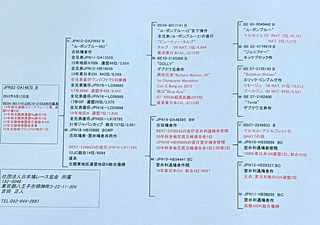 | 出品鳩の同系が、栃木地区連盟五峰連合会2020年秋季菊花賞レースで1位、1位と同着の2位です。また、北関東連盟、北陸南連盟で数多くシングルに入賞しています。父方祖父は、宮下博作ル・ボンブルー12号です。父方祖母は、デブクワ兄弟作で兄弟に15年のオリンピアードがいます。兄弟の直仔は2020年マルセイユNで2,102羽中1位です。2017年カオールN5,639羽中2位鳩もいます。同系がワンロフトで多数優勝しています。母方祖父は、マルセル・アエルブレヒト作のBAK17の孫の直仔です。マルセル・アエルブレヒト作のBAK17の孫の直仔は、栃木地区連盟五峰連合会2020年秋季菊花賞レースで1位です。母方祖母の直仔は、栃木地区連盟五峰連合会2020年秋季菊花賞レースで1位と同着の2位です。母方祖母は、室井利通鳩舎作で2016年東日本CH総合4位です。一族が縦横斜めでとにかく飛んでいます。出品鳩の同系3羽が2021年ジャパンカップで記録し、4羽が2023年東日本CHで記録し、東日本CHで2024年2羽、2025年2羽帰還しています。 |