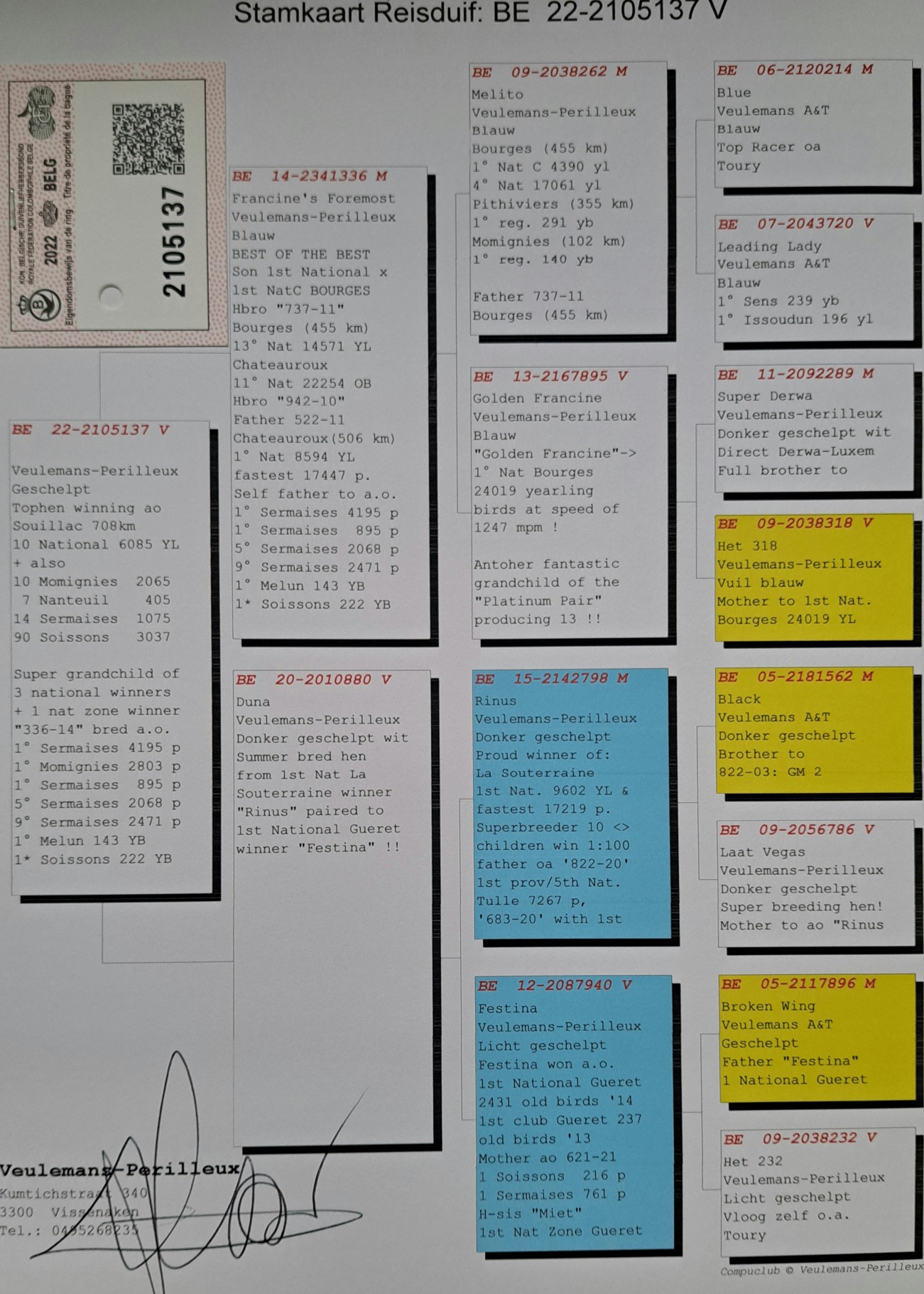 ベルギー若手強豪鳩舎、ヒューレマンス作翔鳩、2023スイヤック708Kmイヤリング6085羽中10位(10912羽中15位).Momignies2065羽中10位、Nanteuil405羽中7位、Sermaises1075羽中14位、Soissons3037羽中90位祖父母の代3羽がナショナル1位チャンピオン、1羽がナショナルZon1位ナショナル4位。優勝チャピオンの集大成。類を見ない驚異の血統構成から生まれたトップレ−サ−!!! 早い者勝ち。 ☆直仔がRG400kにて945羽中84位90位入賞(全兄弟同腹)委託先にて孫が100kレ−ス1500羽程の参加中3位入賞(直仔×直仔)既に種鳩としても結果を出してる優鳩です。血統構成、種鳩実績共に文句無しの優鳩です。