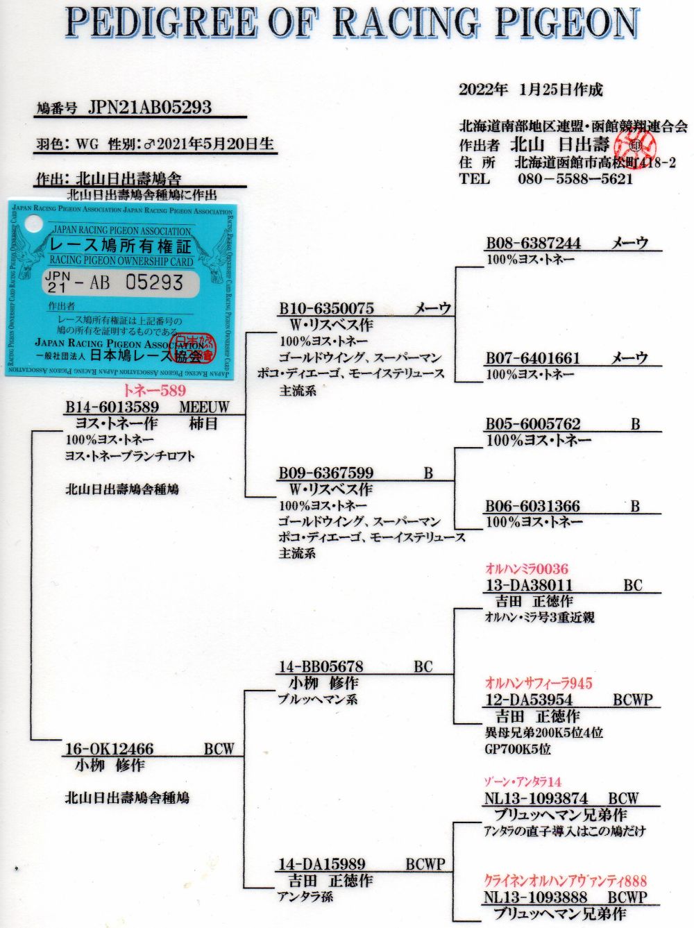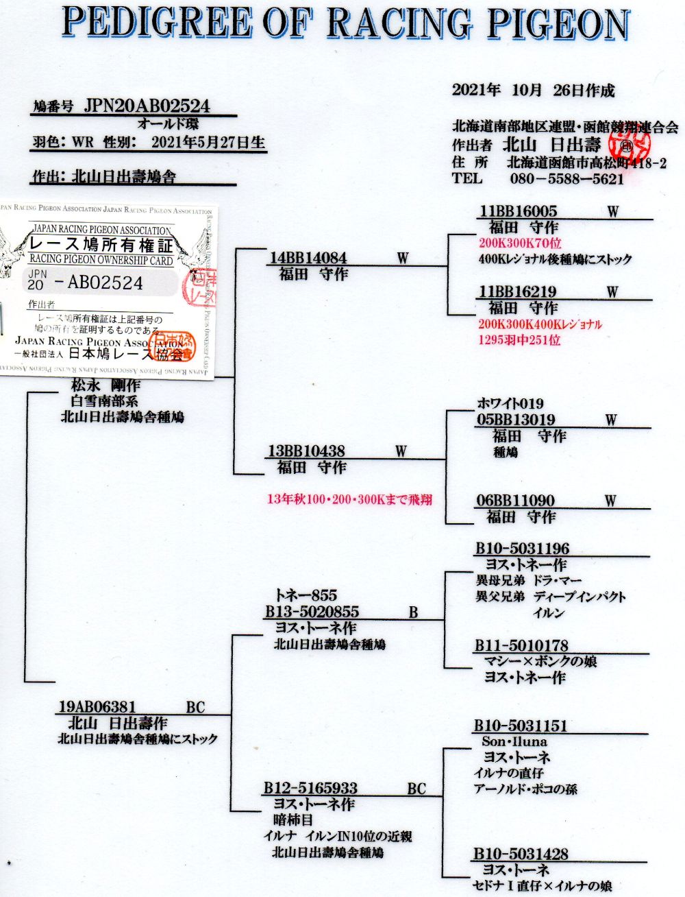 | 【21AB05293WMオス・20AB02524WSメス】 「北山日出壽鳩舎作」 良い種鳩です。今シーズン3ペアー作出・まだ若いので、今後十分作出可能です。 白雪南部の血統もはいってます。メスはオールド環21年生です。 父 北山日出寿鳩舎作 長距離系 直系に入賞多 母 北山日出寿鳩舎作 長距離系 直系に入賞多数所有者:新潟春日「松永 剛 鳩舎」 発送は、すべて送料元払い3,000円で第一貨物は1箱4羽まで営業所留となります。また、発送できない営業所がありますので確認して下さい。・九州・四国・沖縄は発送できません。 性別は、オス・ メス 詳細は系統書を載せましたのでご覧下さい。
