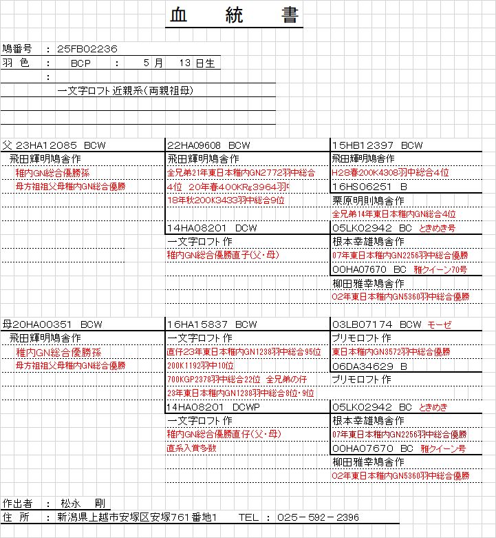 | 【25FB02236オスBCP】 「松永鳩舎作」 GN総合優勝孫(父・母GN総合優勝孫・飛田鳩舎は、日本の最優秀鳩舎賞受賞・CH・GNベストテン入賞・協会最高賞受賞鳩舎です。)よい種鳩になると思います。 この血統の鳩は、なかなか入手困難です。(素晴らしい血統です。) 父 飛騨輝明鳩舎作 直系に長距離優入賞多数 GN総合優勝孫 母 飛騨輝明鳩舎作 直系に長距離入賞多数 GN総合優勝孫所有者:新潟春日「松永 剛 鳩舎」 発送は、送料元払い3,000円で第一貨物のみで1箱4羽までで営業所留となります。また、第一貨物でも送れない営業所がありますので、確認して下さい。なお、九州・四国沖縄、離島は発送できません。 性別は、 オス 若のため性別の誤りはご容赦下さい。 詳細は系統書を載せましたのでご覧下さい。 |