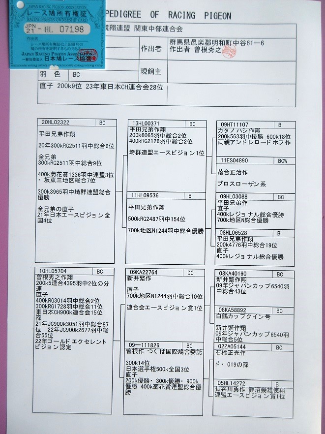 | 300kRg2511羽中総合6位×200k5連合4395羽中2位の分速 BC ♂ | オークションNo: 1761732910 |