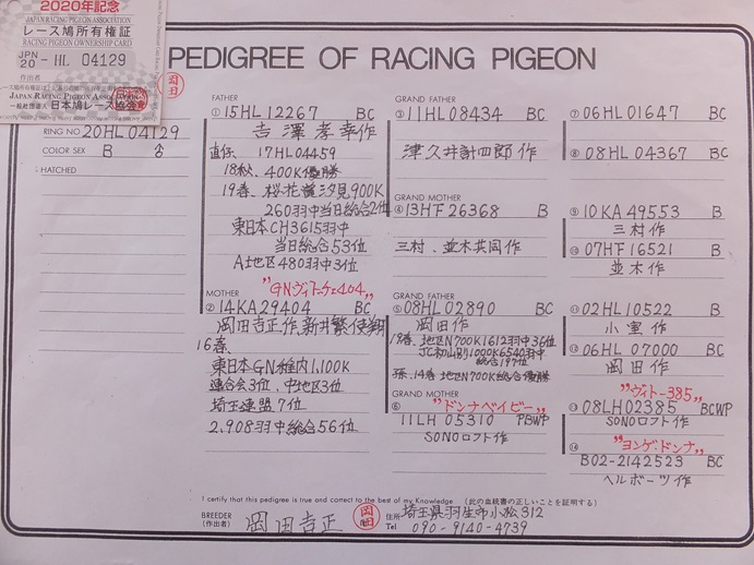 | 20年04129 ♂ 東日本CH3,615羽中総合53位の父鳩×東日本GN2,908羽中総合56位 | オークションNo: 1763685313 |