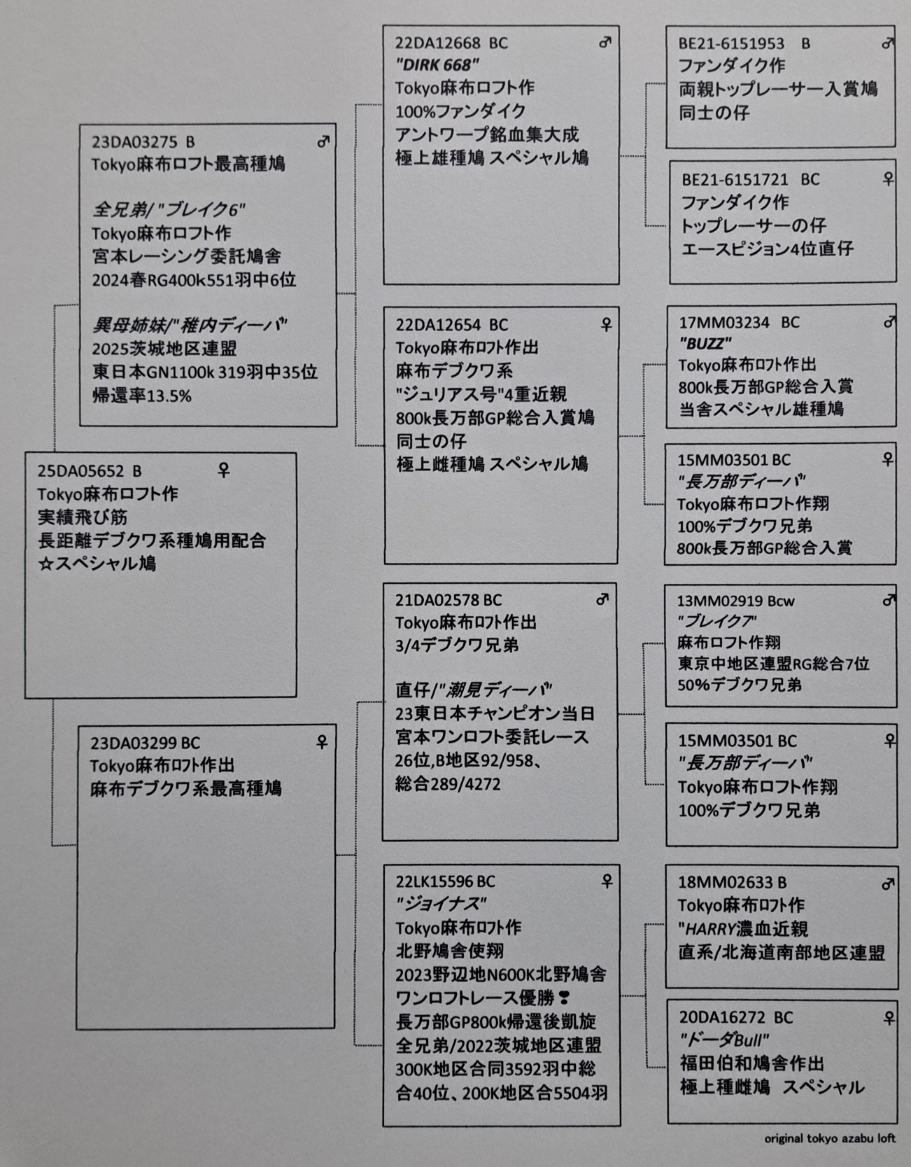 当舎デブクワ系の特徴が色濃く出てる極上鳩です。東日本チャンピオン当日入賞、難レ−スの稚内グランドナショナル入賞、中距離RGのスピードレ−スにも対応出来る信頼してるのラインになります。