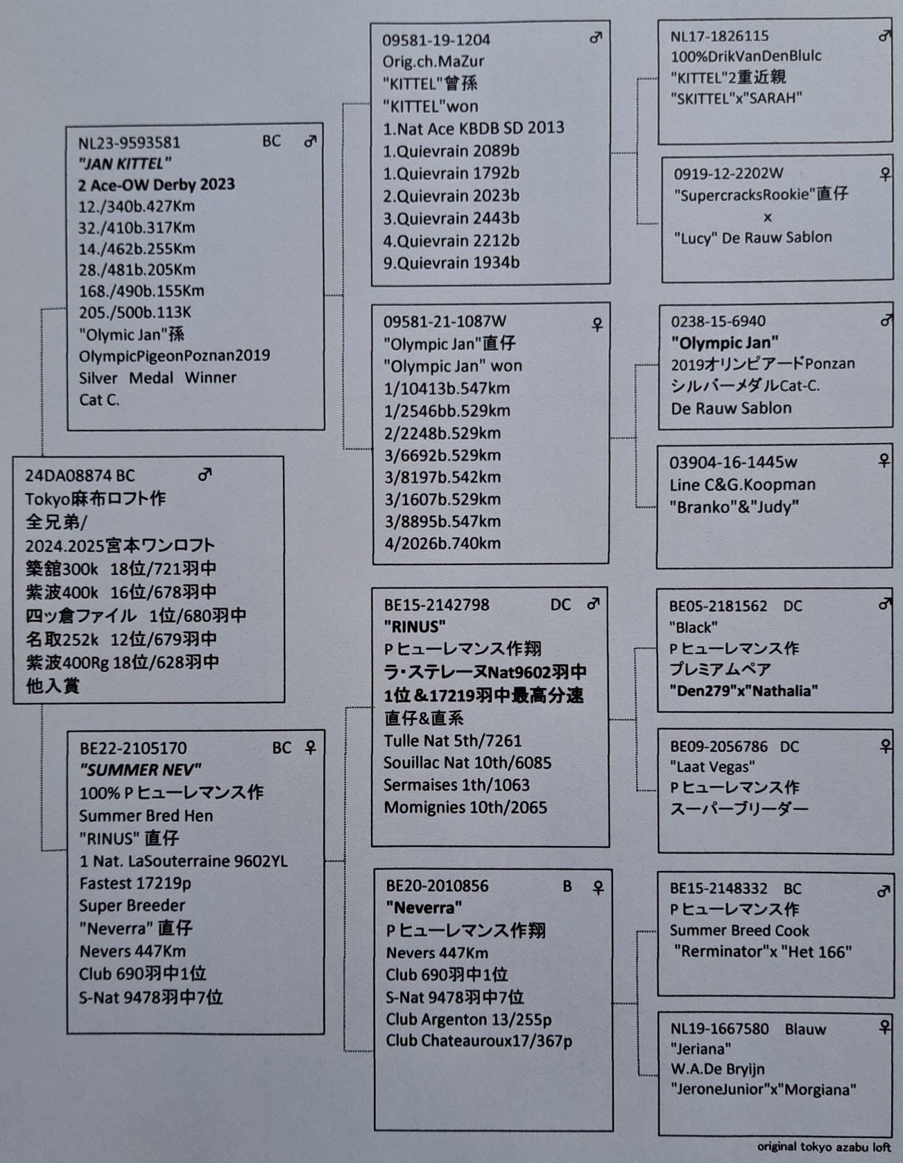 父親♂は2023ドイツ🇩🇪ワンロフトにてエ−スピジョン2位、なおかつ"Olympic Jan"2019オリンピア−ドCat-C第2位の孫になります。母親♀100%ヒューレマンス、ラステレ−ヌNat17219羽中最高分速"RINUS"の直仔母親はすでに居ませんのでこの当たり配合をお早めに。