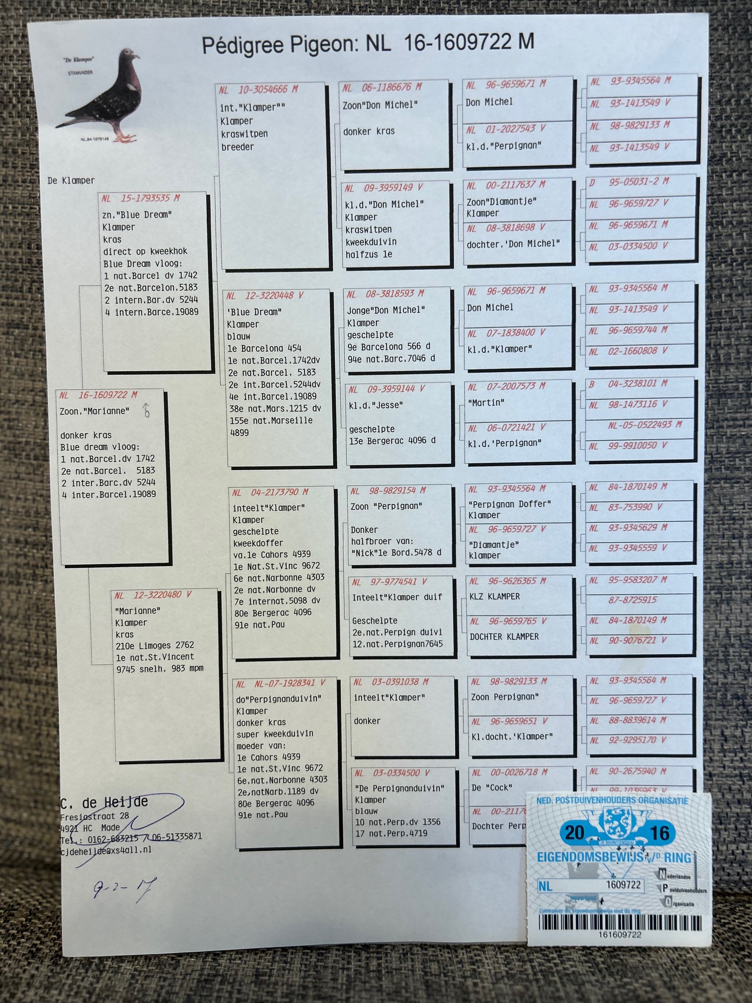 | NL16-1609722 BC雄コールデハイデ作チャンピオン鳩直仔 DNA鑑定書付 | オークションNo: 1765002200 |