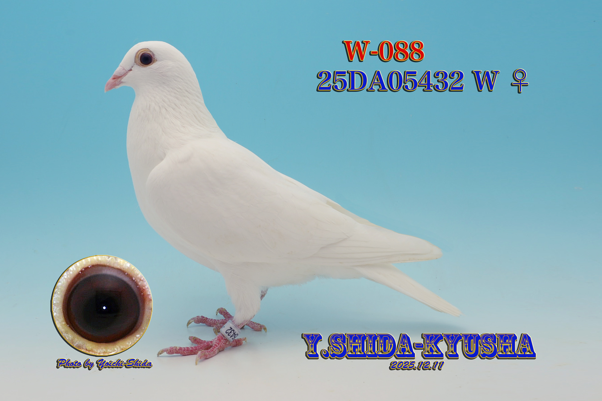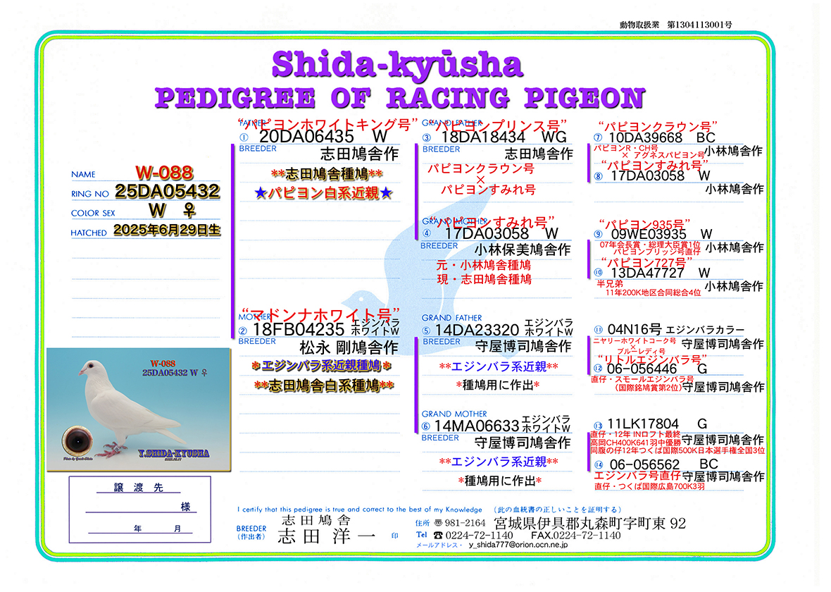 | W-088 ☆★パピヨンホワイトキング号パピヨン系❎マドンナホワイト号エジンバラ系★☆ 25DA05432 W ♀ 志田鳩舎作 中・長距離 ホワイト系スピードタイプ 2025年6月29日生 体型中 手にスッポリ納まるバランスの良いトリ 父.20DA06435 W 志田鳩舎作 ❝パピヨンホワイトキング号❞ パピヨンすみれ号の近親種鳩 志田鳩舎パピヨン系種鳩 祖父.18DA18434 WG 志田鳩舎作 ❝パピヨンプリンス号❞ パピヨン系ホワイト種鳩 パピヨンすみれ号直仔×パピヨンすみれ号 曽祖父.10DA39668 BC 小林保美鳩舎作 ❝パピヨンクラウン号❞ 全兄弟直仔・平成30年度KBDB会長賞(総理大臣賞連盟1位) ❝花音・パピヨン号❞ パピヨンR・CH号(99年 R・CH 認定鳩)×アグネスパピヨン号 曽祖母.17DA03058 W 小林保美鳩舎作出 現・志田鳩舎種鳩 ❝パピヨンすみれ号❞ (元・小林保美鳩舎種鳩) パピヨンブリッジ号(07年会長賞1位・総理大臣賞1位)の孫 祖母.17DA03058 W 小林保美鳩舎作出 現・志田鳩舎種鳩 ❝パピヨンすみれ号❞ (元・小林保美鳩舎種鳩) パピヨンブリッジ号(07年会長賞1位・総理大臣賞1位)の孫 曽祖父.09WE03935 W 小林保美鳩舎作 ❝パピヨン935号❞ 半兄弟・2012年地区ナショナル総合2位 2007年 会長賞1位・総理大臣賞1位 ❝パピヨンブリッジ号❞直仔 曽祖母.13DA47727 W 小林保美鳩舎作 ❝パピヨン727号❞ 兄弟掛け配合 種鳩用に作出 半兄弟・2011年200K地区合同 2,672羽中総合4位 母.18FB04235 エジンバラホワイトW 松永 剛鳩舎作 ❝マドンナホワイト号❞ エジンバラ系近親 貴重なエジンバラホワイト長距離系種鳩 祖父.14DA23320 エジンバラホワイトW 守屋博司鳩舎作 エジンバラ系近親種鳩用に作出 曽祖父.04N16号 エジンバラカラー 守屋博司鳩舎作 ニヤリーホワイトコーク号×ブルーレディ号 曽祖母.06-056446 G 守屋博司鳩舎作 ❝リトルエジンバラ号❞ 直仔国際銘鳩賞第2位スモールエジンバラ号 祖母.14MA06633 エジンバラホワイトW 守屋博司鳩舎作 エジンバラ系近親種鳩用に作出 曽祖父.11LK17804 G 守屋博司鳩舎作 曽祖母.06-056562 BC 守屋博司鳩舎作 エジンバラ号直仔 *Lサイズの写真1枚をサービス致します。出品鳩の所有権証は発送時に添付します。 *性別判定は、100%では有りません。*また、老鳩の場合、作出保証は有りませんので御理解の上、御入札を御願いします。 *落札後の交換・キャンセルはお受け出来ません。予めご了承下さい。 ☆★御入札の前に、当鳩舎からの発送方法の確認と自己紹介欄を御読み下さい★☆ |