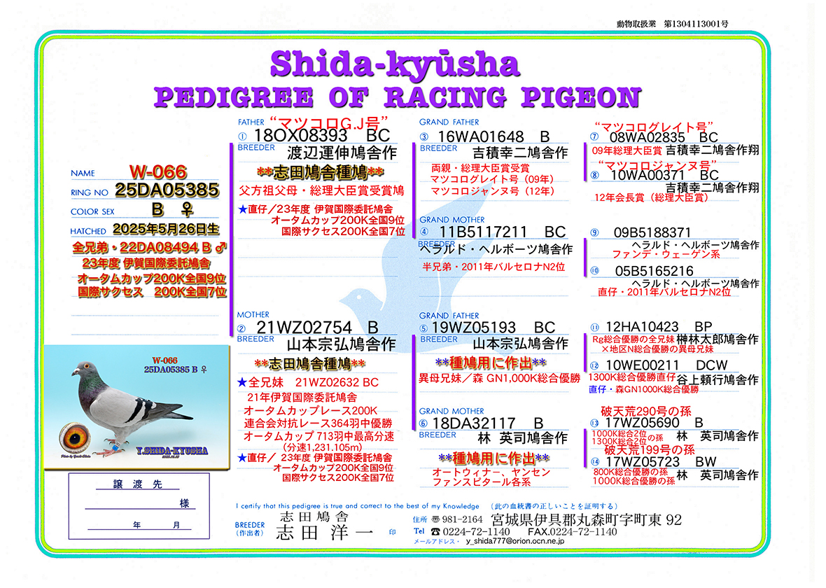 | W-066 ☆★ 23年度 伊賀オータムカップ200K全国9位・国際サクセス200K全国7位の全兄弟★☆ 25DA05385 B ♀ 志田鳩舎作 総理大臣賞系 2025年5月26日生 体型・中 中・長距離種鳩用に作出 全兄弟・23年度 伊賀国際委託鳩舎 オータムカップ200K 527羽中全国9位 23年度 伊賀国際サクセスレース200K 247羽中全国7位(2レース連続一桁入賞) (23年度オータムカップ 全国9位とサクセスレース 全国7位は同一鳩) 父.18OX08393 BC 渡辺運伸鳩舎作 ❝マツコロG.J号❞ 志田鳩舎種鳩 マツコログレイト(総理大臣賞)・マツコロジャンヌ(総理大臣賞)の孫 直仔・23年度 伊賀国際委託鳩舎 オータムカップ200K 527羽中全国9位 23年度 伊賀国際サクセスレース200K 247羽中全国7位(2レース連続一桁入賞) 祖父.16WA01648 B 吉積幸二鳩舎作 両親総理大臣賞(マツコログレイト・マツコロジャンヌ) 曽祖父.08WA02835 BC 吉積幸二鳩舎作翔 マツコログレイト号 09年春 総理大臣賞 亀田600K地区ナショナル総合2位 木造1,000K桜花賞総合優勝 曽祖母.10WA00371 BC 吉積幸二鳩舎作翔 マツコロジャンヌ号 12年春 会長賞(総理大臣賞) 三条600K地区ナショナル総合7位 木造1,000K桜花賞総合2位 祖母.11B5117211 BC ヘラルド・ヘルボーツ鳩舎作 ファンデウェ−ゲン系 半兄弟・2011年バルセロナN総合2位 曽祖父.09B5188371 ヘラルド・ヘルボーツ鳩舎作 ファンデウェ−ゲン系 曽祖母.05B5165216 ヘラルド・ヘルボーツ鳩舎作 バルセロナ4回入賞 直仔・2011年バルセロナN総合2位 母.21WZ02754 B 山本宗弘鳩舎作 志田鳩舎種鳩 全兄妹・2021年伊賀国際委託鳩舎 オータムカップ200K 連合会対抗レース364羽中優勝/オータムカップ713羽中最高分速 21WZ02632 BC (分速1231.105m) 協会レース鳩誌2021年12月号P64参照 直仔・23年度 伊賀国際委託鳩舎 オータムカップ200K 527羽中全国9位 23年度 伊賀国際サクセスレース200K 247羽中全国7位(2レース連続一桁入賞) 祖父.19WZ05193 BC 山本宗弘鳩舎作 種鳩用に作出 異父兄弟・森 GN1,000K総合優勝 曽祖父.12HA10423 BP 榊 林太郎鳩舎作 曽祖母.10WE00211 DCW 谷上頼行鳩舎作 直仔・森 GN1,000K 総合優勝 両親 赤松正紀鳩舎長距離系 祖母.18DA32117 B 林 英司鳩舎作 種鳩用に作出 破天荒系 曽祖父.17WZ05690 B 林 英司鳩舎作 オート:ヤンセン×ファンスピタール 破天荒290号・199号孫 曽祖母.17WZ05723 BW 林 英司鳩舎作 *Lサイズの写真1枚をサービス致します。出品鳩の所有権証は発送時に添付します。 *性別判定は、100%では有りません。*また、老鳩の場合、作出保証は有りませんので御理解の上、御入札を御願いします。 *落札後の交換・キャンセルはお受け出来ません。予めご了承下さい。 ☆★御入札の前に、当鳩舎からの発送方法の確認と自己紹介欄を御読み下さい★☆ |