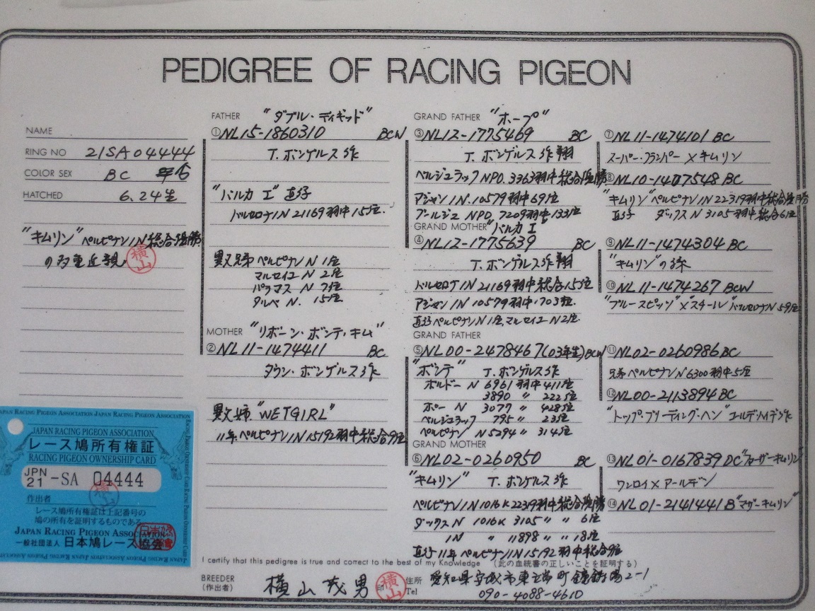 | ベルジュラック総合優勝+バルセロナIN総合15位×銘鳩キムリン(ペルピナンIN総合優勝)の娘 | オークションNo: 1766723356 |