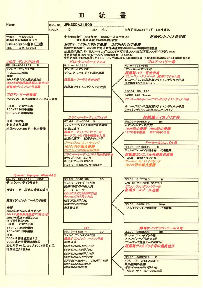 | ●ディルクファンダイク作同士の直仔 孫: 2025年ミヤモトレーシング200k4位 ひ孫:ミヤモトレーシング400k優勝 RG総合3位 同ライン活躍多数あり!! ● ぜひ、直仔を使ってみてください。 (★バリューピジョン吉田鳩舎のYOU TUBE動画はココをクリックしてご覧下さい!!★) ●●●離島の方は入札お控え下さい ●●● ●冬季のみ、沖縄郵便局留め行います。 11月〜3月頃まで予定 条件は数日間の輸送になるため死亡免責 ゆうパック後払いにて発送 沖縄郵便局留めのみ、詳しくはお問合せ下さい。 ●発送方法は良くお読み下さい ● 北海道、九州地方、四国、本州地域 ゆうパック後払い発送出来ます!! ●発送日は此方の都合で予定日をお知らせしますのでご了承ください。 ●基本、土曜日、日曜発送 ●来舎歓迎● 上信越道富岡ICより10分程度 群馬サファリワールド、磯部温泉 日帰り温泉等 世界遺産富岡製糸等観光も出来ます! ●詳しくは血統書をご覧下さい 【脚環番号】 25DA21509 【羽色】 B 【眼色】 銀眼 【体型】中型、筋肉良、鳩質良し 筋肉良・骨格良、 【性別】 オス ★これから鳩を始める方応援しています! ★鳩は種鳩集め、最初が肝心です! ★メール、電話でのお問い合わせもお気軽にどうぞ ●TEL090−2676−0460 ● valuepigeon@ymail.ne.jp ご連絡お待ちしております。 |
