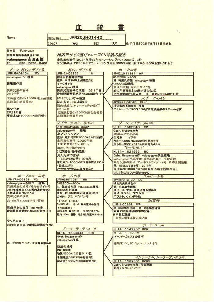 | ●白の飛び筋! 全兄弟の仔 ミヤモトレーシングRG400k1,3位 全兄弟の孫等活躍!! 落札金額+持ち込み料1000円のお振込みを お願い致します。 (★バリューピジョン吉田鳩舎のYOU TUBE動画はココをクリックしてご覧下さい!!★) ●●●離島の方は入札お控え下さい ●●● ●冬季のみ、沖縄郵便局留め行います。 11月〜3月頃まで予定 条件は数日間の輸送になるため死亡免責 ゆうパック後払いにて発送 沖縄郵便局留めのみ、詳しくはお問合せ下さい。 ●発送方法は良くお読み下さい ● 北海道、九州地方、四国、本州地域 ゆうパック後払い発送出来ます!! ●発送日は此方の都合で予定日をお知らせしますのでご了承ください。 ●基本、土曜日、日曜発送 ●来舎歓迎● 上信越道富岡ICより10分程度 群馬サファリワールド、磯部温泉 日帰り温泉等 世界遺産富岡製糸等観光も出来ます! ●詳しくは血統書をご覧下さい 【脚環番号】 25JH01440 【羽色】 WG 【眼色】 銀眼 【体型】中型、筋肉良、鳩質良し 筋肉良・骨格良、 【性別】 メス ★これから鳩を始める方応援しています! ★鳩は種鳩集め、最初が肝心です! ★メール、電話でのお問い合わせもお気軽にどうぞ ●TEL090−2676−0460 ● valuepigeon@ymail.ne.jp ご連絡お待ちしております。 |