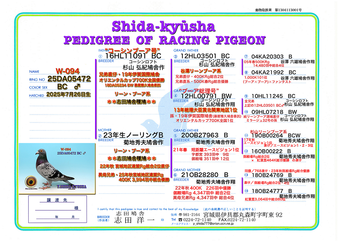 | 😀㊕W-094 ☆★超飛び筋 杉山❝ブーア総理号❞直仔❎宮城Rg総合2位直仔 菊地リーンブーア系★☆ 25DA05472 BC ♂ 志田鳩舎作 リーンブーア系 2025年7月26日生 体型・中 中距離系のスピードタイプ種鳩用 父.16HL11091 BC 第37回 日本優秀鳩舎賞全国2位 コーシンロフト杉山 弘紀鳩舎作 ❝コーシンブーア号❞ 13年総理大臣賞北関東地区第1位 ❝ブーア総理号❞ の直仔 全兄弟直仔・19年伊賀国際鳩舎オリエンタルカップ700K全国1位(藤屋雅久鳩舎委託) 祖父.12HL03501 BC コーシンロフト杉山 弘紀鳩舎作 谷澤リーンブーア系 兄弟直仔・400Kレジョナル総合2位 兄弟直系・春500Kレジョナル総合優勝 他総合シングル多数 曽祖父.04KA20303 B 谷澤 六雄鳩舎作翔 ブーア❎レジェース 05年春500Kレジョナル14,480羽中4位 谷澤作400K総合2位の直仔 従兄弟・初山別1,000K総合1位 曽祖母.04KA21992 BC 谷澤 六雄鳩舎作翔 1,000K101位(ブーア×ブーア)✖︎ファンタスト 祖母.12HL00791 BW コーシンロフト杉山 弘紀鳩舎作翔 ❝ブーア総理号❞ 13年総理大臣賞北関東地区1位 13年春 東日本CH 連合会2位 連盟総合3位 900K A地区13位 700K 地区N 1,656羽中総合30位 連合会7位 孫・19年伊賀国際鳩舎オリエンタルカップ700K全国1位(藤屋雅久鳩舎委託) 曽祖父.10HL11245 BC コーシンロフト杉山 弘紀鳩舎作 谷澤リーンブーア系 全兄弟・上記の12HL03501 BC ♂ 曽祖母.09HL07218 BW コーシンロフト杉山 弘紀鳩舎作翔 ❝純リーンブーア源鳩ミラージュ72号直仔❞ 自身及び兄弟直系・春レジョナル500K総合優勝 他総合シングル多数 ✧✦✧リーンブーア ミラージュ32号の孫鳩✧✦✧ 母.23年生ノーリング B 菊地秀夫鳩舎作 現・志田鳩舎種鳩 リーンブーア系 短距離エースピジョン1位 ❎御殿場Rg 4,347羽中総合2位 祖父.20OB27963 B 菊地秀夫鳩舎作翔 リーンブーア系 2021年 春 短距離エースピジョン1位 宇都宮 393羽中9位 御殿場 351羽中12位 曽祖父.19OB00264 BCW 菊地秀夫鳩舎作翔 2017年秋 エースピジョン1位 直仔/2019年秋 エースピジョン2位 曽祖母.16OB00222 B 菊地秀夫鳩舎作翔 リーンブーア系 (御殿場Rg 337K3,071羽中総合2位❎紅葉賞464K1,333羽中総合優勝) 祖母.21OB28280 B 菊地秀夫鳩舎作翔 22年秋 御殿場レジョナル4,347羽中総合2位 異母兄弟・25年秋 400Kレジョナル3,994羽中総合優勝 曽祖父.18OB24769 B 菊地秀夫鳩舎作翔 100K 764羽中16位 250K 460羽中 3位 同腹・21OB24768 エースピジョン3位 直仔/紅葉賞 303羽中総合2位 御殿場Rg 4,347羽中総合4位 曽祖母.18OB24777 B 菊地秀夫鳩舎作翔 Rg総合優勝の直仔 紅葉賞 3,064羽中総合60位 *Lサイズの写真1枚をサービス致します。出品鳩の所有権証は発送時に添付します。 *性別判定は、100%では有りません。*また、老鳩の場合、作出保証は有りませんので御理解の上、御入札を御願いします。 *落札後の交換・キャンセルはお受け出来ません。予めご了承下さい。 ☆★御入札の前に、当鳩舎からの発送方法の確認と自己紹介欄を御読み下さい★☆ |