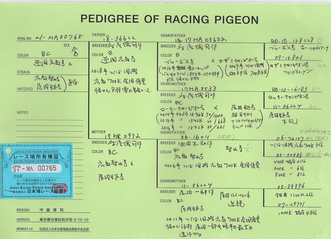 | ※この鳩は、委託出品です。本紹介文などを熟読され入札のご検討をお願いいたします。 2018つくば国際鳩舎広島700K全国優勝「逆風広島号」直仔です。 「逆風広島号」自体がルーマニア超長距離鳩「ブルーボス」「ロッキーチャンピオン」の血筋をもつ、本来なら1000K以上を期待できる鳩だろうと思います。 配合鳩♀も06年・11年つくば国際広島700K優勝鳩ペア「広島勢山号」「尾内姫号」の配合鳩です。 委託レースのみならず地区レースでも戦力になりそうなオスですね。詳しくは血統書をご参照ください。 【ご協力のお願い】 冒頭でもお知らせしましたが、この鳩は委託出品です。 落札後のお支払いは現金書留もしくは銀行振込(楽天銀行)でお願いします。 委託出品のため、極力速やかにお取引してくださる方の入札をお願いいたします。 ゆうちょ銀行口座からでも銀行口座への振り込みは可能ですので、ご理解のほどよろしくお願いいたします。 |