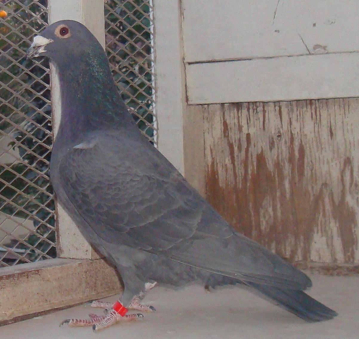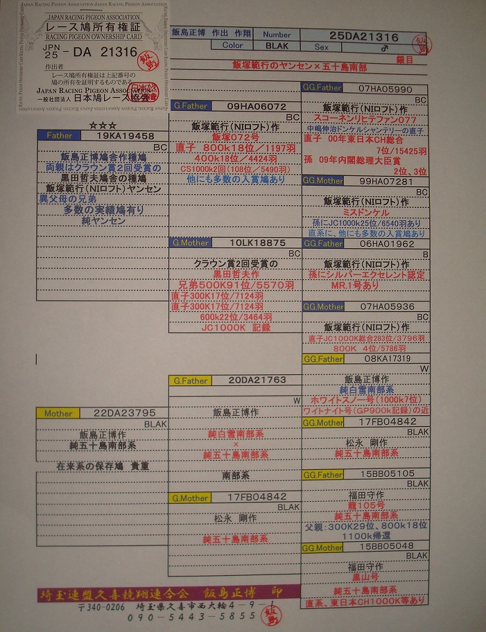 | 五十島南部の真黒に飯塚範行鳩舎の代表種鳩のヤンセンをかけてみました。真黒に出ました。♂です。勝手ながらカラス16号と名付けました。詳しくは血統書をご覧ください。 |