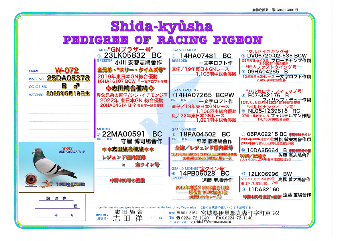 | W-072 ☆★19年東日本GN 総合優勝の全兄弟❎レジェンド稚内号弟・宝クイン号直仔★☆ 25DA05378 B ♂ 志田鳩舎作 グランドナショナル長距離総合優勝の系統 2025年5月19日生 体型:中 超・長距離種鳩用に作出 父.23LK05832 BC 第37回 日本優秀鳩舎賞全国4位 小川 安都志鳩舎作 ❝GNブラザー号❞ 志田鳩舎種鳩 マルセイユIN総合優勝直仔✖️バルセロナIN総合優勝直仔 全兄弟/16HA16107 BCW ♀ 一文字ロフト作翔 ❝スリー・タイムズ号❞ 2019年東日本GNレース1,106羽中総合優勝 分速1,394.228m 異父兄弟の直仔/20HA04514 B ♀ 菅谷 淳一鳩舎作翔 ❝シン・イチモンジ号❞ 2022年東日本GNレース1,891羽中総合優勝 分速990.400m 祖父.14HA07481 BC 一文字ロフト作 マルセイユキング号×稚内ファストウイング号 直仔・16HA16107 2019年東日本GNレース1,106羽中総合優勝 曽祖父.DV06720-02-535 BCW ブローキャンプ作翔 ❝マルセイユキング号❞ 2005年マルセイユINレース13,930羽中総合優勝 曽祖母.09HA04265 B 一文字ロフト作翔 ❝稚内ファストウイング号❞ 2012年東日本GNレース 2,488羽中総合優勝 祖母.14HA07265 BCPW 一文字ロフト作 直仔・16HA16107 BCW ♀ 一文字ロフト作翔 2019年東日本GNレース1,106羽中総合優勝 分速1,394.228m 孫・20HA04514 B ♀ 菅谷淳一鳩舎作翔 ❝シン・イチモジ号❞ 2022年東日本GNレース 1,891羽中総合優勝 分速990.400m 曽祖父.F07-382176 B フィリップ・デュー作翔 ❝バルセロナフィリップ号❞ 2012年バルセロナINレース25,348羽中総合優勝 曽祖母.NL05-1239818 RC フェルテルマン作翔 ❝ペルピナンクイーン号❞ 2007年ペルピナンINレース14,756羽中総合優勝 母.22MA00591 BC 守屋博司鳩舎作 現・ 志田鳩舎種鳩 レジェンド稚内号全兄弟❎宝クイン号 祖父.18PA04502 BC 野沢義徳鳩舎作 全姉/16PA01039 B ♀❝レジェンド稚内号❞ 2017年東日本GN1,200K2,828羽中総合優勝 分速614.154m 帰還5羽の東日本GN史上最悪の難レース 曽祖父.05PA02215 BC 松村敏夫鳩舎作翔 2006年桜花賞900K連盟4位 曽祖母.10DA35664 佐藤廣志鳩舎作 (中野400直仔❎咲那木の花号) 異母兄弟・2007年東日本GN1,200K静岡連盟2位(楊飛治号) 楊飛治号の直仔ロマネスク号2010年東日本GN1,200K静岡連盟唯1羽帰り優勝 祖母.14PB06028 BC 遠藤 宝鳩舎作翔 ❝宝クイン号❞ 2015年地区N600K総合11位 2015年桜花賞900K総合3位 帰還10% 曽祖父.12LK06996 BW 高橋善之鳩舎作 2004年ジャパンカップ1,000K3,507羽中2位の孫 2006年東日本CH1,000K8,458羽中7位の孫 曽祖母.11DA32160 遠藤 宝鳩舎作 中野400直仔❎直仔 *Lサイズの写真1枚をサービス致します。出品鳩の所有権証は発送時に添付します。 *性別判定は、100%では有りません。*また、老鳩の場合、作出保証は有りませんので御理解の上、御入札を御願いします。 *落札後の交換・キャンセルはお受け出来ません。予めご了承下さい。 ☆★御入札の前に、当鳩舎からの発送方法の確認と自己紹介欄を御読み下さい★☆ |