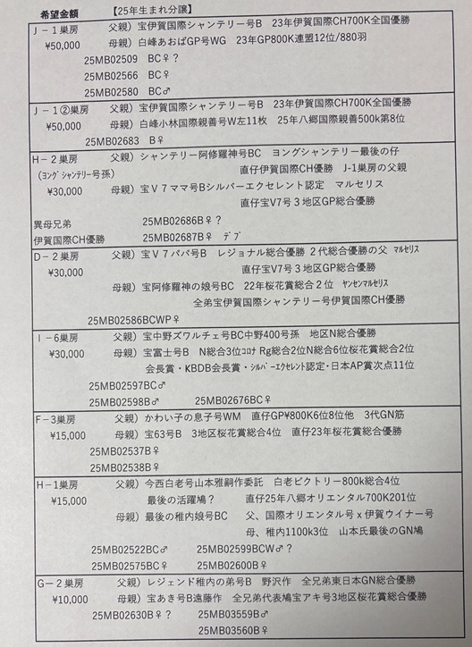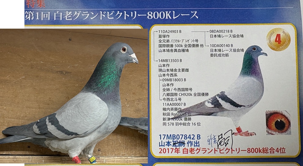 山本雅嗣氏の恐らく最後の活躍鳩と思われる元嶌田氏種鳩の♂鳩と最後に稚内入賞した鳩の娘で頂いた鳩をペアで出品致します。年末にお亡くなりになられましたので大事にして頂ける方に譲りたいと思います。国際鳩舎で活躍の血も絡んでいます。希望としては直仔4羽付でと思っています。写真3枚目のH-1巣房参照ください。(他配合もお問い合わせください。2羽1割3羽2割引き)★関東お届けもします。他JALカーゴ等