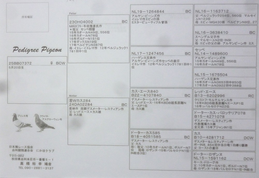 | 母方は埼玉で飛んでます。引き合いあり母鳩はトレードされたそうです。メスと思われますが若鳩のため性別は不明とさせていただきます。発送はゆうパック後払い、第一貨物着払い、JAL便です。発送手数料500円のご負担をお願いします。発送の手配の都合上落札後早期に連絡くださるようお願いします。落札後メールが届かないことが時々あります。連絡ないときは電話連絡いただければ助かります。 |