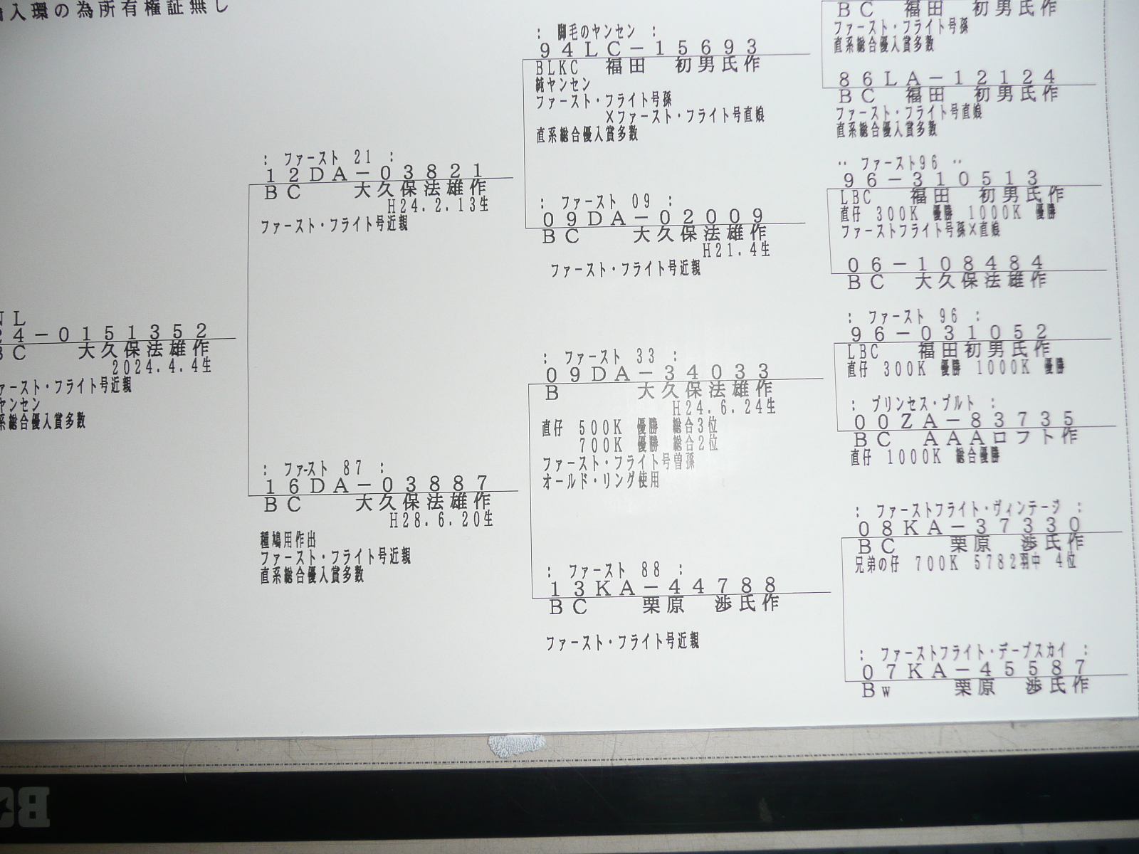 | 02-09 NL24-151352 BC ♂ (輸入脚環装着の為所有権証有りません) * 上記血統書参照 * 性別の誤りは、ご理解下さい。 * 神経質な方の、ご入札はお控え下さい。 * 落札後郵便番号・住所・氏名・電話番号お願いします。 * 鳩落札代金+持ち込み料1.000円ご負担ください。 * 御自宅まで着払いにて発送致します。 * 送れない場合は、キャンセルさせて頂きます事ご理解下さい。 * 沖縄県及び離島への発送出来ません。 * 速やかな取引を心がけております。 * 090-2303-0891 0297-95-0956 * 上記文面を、ご理解の上入札お願いします。 |