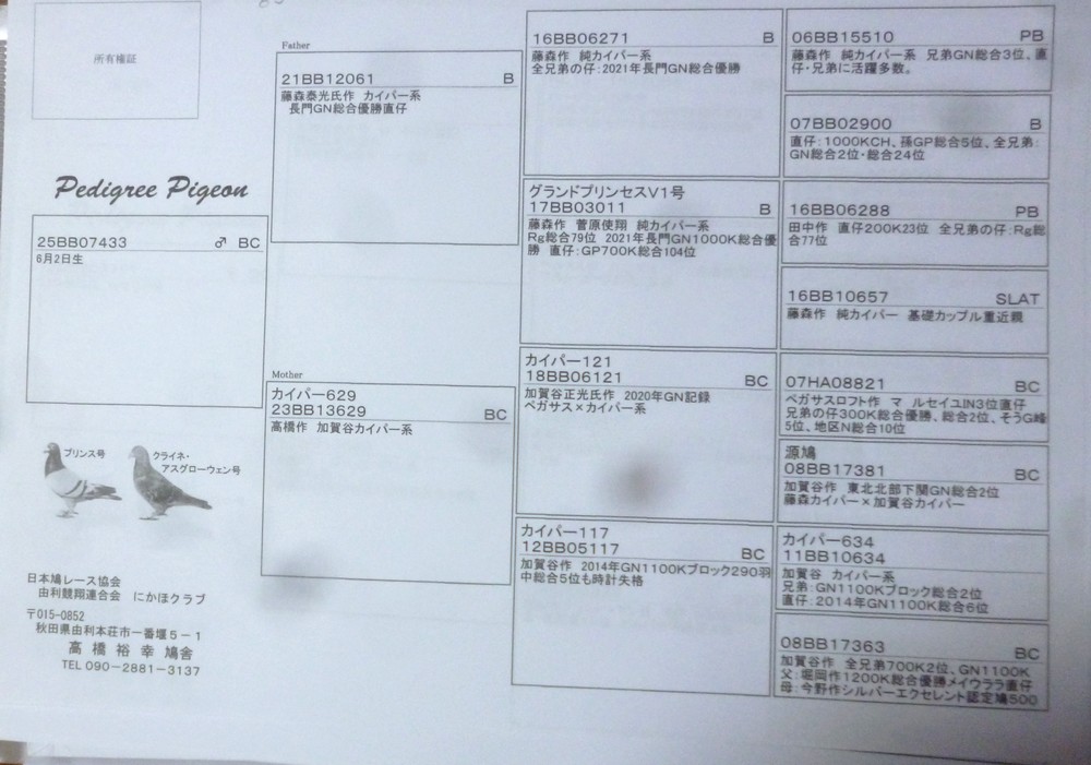 | お勧め良鳩です。オス。発送はゆうパック後払い、第一貨物着払い、JAL便です。発送手数料500円のご負担をお願いします。発送の手配の都合上落札後早期に連絡くださるようお願いします。落札後メールが届かないことが時々あります。連絡ないときは電話連絡いただければ助かります。 |