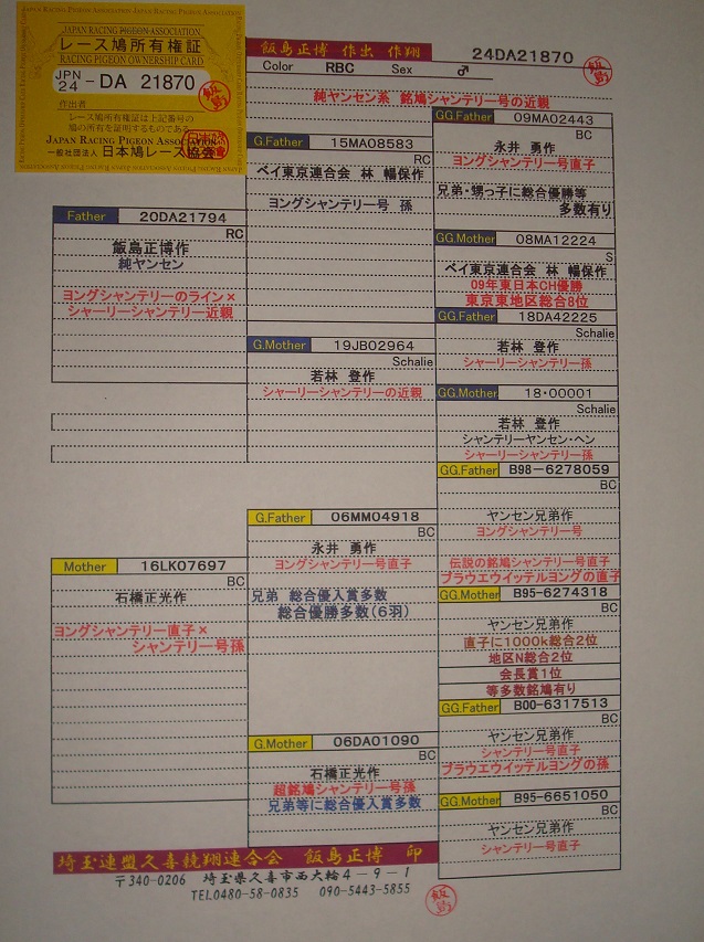 | ヤンセン作のヨングシャンテリー号(永井勇鳩舎の代表種鳩)とシャーリーシャンテリー号(若林登鳩舎の代表種鳩)の近親になります。RCとBCの中間の羽色になりました。手持ち見栄えの良い♂鳩です。詳しくは血統書をご覧ください。 |