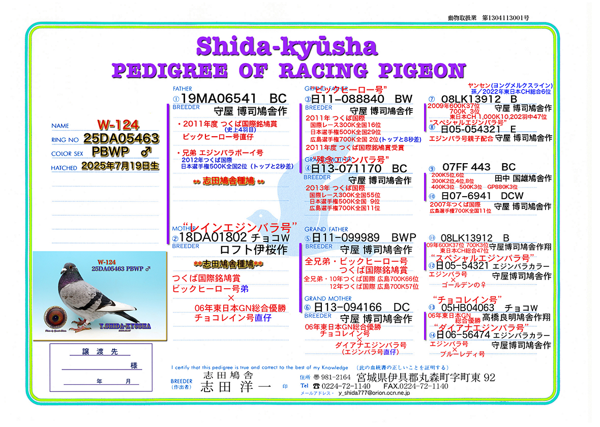 | W-124 ☆★エジンバラ系ビックヒーロー直仔❎チョコレイン・エジンバラ系★☆ 25DA05463 PBWP ♂ 志田鳩舎作 国際鳩舎委託用に作出 2025年7月19日生 体型・中 超飛び筋の素晴らしいトリ 父.19MA06541 BC 守屋博司鳩舎作 エジンバラ系 現・志田鳩舎種鳩 2011年度 つくば国際銘鳩賞受賞 ビックヒーロー号直仔 異母兄弟・エジンバラボーイ号(2012年つくば国際日本選手権全国2位)トップと2秒差 祖父.日11-088840 BW 守屋博司鳩舎作 ❝ビックヒーロー号❞ 2011年つくば国際 国際レース300K全国16位 日本選手権500K全国29位 広島選手権700K全国2位(トップと8秒差)帰還16羽の難レース 2011年度 つくば国際銘鳩賞受賞 史上4羽目 曽祖父.08LK13912 B 守屋博司鳩舎作 ヤンセン ヨング・メルクスライン 2009年600K3,181羽中総合37位 700K3位 東日本CH 1,000K10,202羽中総合47位 孫・2022年東日本CH5,230羽中6位 曽祖母.日05-054321 エジンバラカラー 守屋博司鳩舎作 ❝スペシャルエジンバラ号❞ エジンバラ号親子配合 祖母.日13-071170 BC 守屋博司鳩舎作 ❝残念エジンバラ号❞ 2013年 つくば国際 国際レース300K全国55位 日本選手権500K全国 9位 広島選手権700K全国11位 曽祖父.07FF443 BC 田中国雄作 200K5位、6位 300K2位、4位、8位 400K3位、500k3位 GP880K3位 曽祖母. 日07-6941 DCW 守屋博司鳩舎作 MORIYA読売号直仔 2007年 つくば国際 広島選手権700K全国11位 母.18DA01802 チョコW ロフト伊桜作 レインエジンバラ号 つくば国際銘鳩賞 ビックヒーロー号の弟 × 06年東日本GN 1,993羽中総合優勝 チョコレイン号直仔 祖父.日11-099989 BWP 守屋博司鳩舎作 スペシャルエジンバラ号直仔 ビッグヒーロー号に酷似したトリ 全兄弟・ビックヒーロー号(つくば国際銘鳩賞) 全兄弟・10年つくば国際 広島700K66位 12年つくば国際 広島700K57位 曽祖父.08LK13912 B 守屋博司鳩舎作 ヤンセン ヨング・メルクスライン 2009年600K3,181羽中総合37位 700K3位 東日本CH 1,000K10,202羽中総合47位 孫・2022年東日本CH5,230羽中6位 曽祖母.日05-054321 エジンバラカラー 守屋博司鳩舎作 ❝スペシャルエジンバラ号❞ エジンバラ号親子配合 祖母.日13-094166 DC 守屋博司鳩舎作 06年東日本GN 1,993羽中総合優勝 チョコレイン号の直仔 (翌日17羽の近年東日本GN史上最悪 雨の難レース ぶっちぎりで勝利したタフネスな銘鳩 ) 曽祖父.05HB04063 チョコW 高橋良明鳩舎作翔 ❝チョコレイン号❞ 06年東日本GN1,993羽中総合優勝 曽祖母.日06-56474 エジンバラカラー 守屋博司鳩舎作 直仔・つくば700K 3羽 *Lサイズの写真1枚をサービス致します。出品鳩の所有権証は発送時に添付します。 *性別判定は、100%では有りません。*また、老鳩の場合、作出保証は有りませんので御理解の上、御入札を御願いします。 *落札後の交換・キャンセルはお受け出来ません。予めご了承下さい。 ☆★御入札の前に、当鳩舎からの発送方法の確認と自己紹介欄を御読み下さい★☆ |