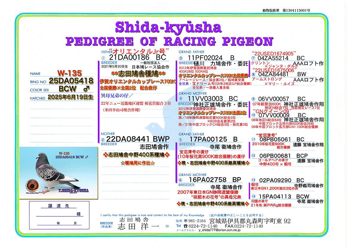 | W-135 ☆★オリエンタルカップ全国1位2位❎中野400号・桐号・咲耶木の花号★☆ 25DA05418 BCW ♂ 志田作 中距離種鳩用に交配 2025年6月19日生 体型・中 肉質最高のトリ 異母兄弟・23DA10994 BCW ♀ 志田洋一作 伊賀国際鳩舎委託 2024年度伊賀オータムカップ200K全国48位 国際ウィナー300K全国60位 父.21DA00186 BC 日本鳩レース協会作 現・志田鳩舎種鳩 2012年 伊賀国際オリエンタルカップレース700K全国1位✖︎全国2位の交配 兄弟の仔・22年ニュー近畿地区連盟 桜花賞総合3位(米田幸由司鳩舎作翔) 直仔・23DA10994 BCW ♀ 志田洋一作 伊賀国際鳩舎委託 2024年度伊賀オータムカップ200K全国48位 国際ウィナー300K全国60位 祖父.11PF02024 B 樋川 力鳩舎作・委託 2012年伊賀国際委託鳩舎400K28位 500K4位 オリエンタルカップレース700K全国優勝 アベレージレース・協会賞2位/銘鳩賞受賞 全兄弟・宝ドリーム号(09年3地区GP総合優勝) 全兄弟の孫・21年秋 山梨地区連盟レジョナル総合優勝 曽祖父.04ZA55214 BC AAAロフト作 クリントン×ジャンヌダルク 曽祖母.04ZA84481 BW AAAロフト作 アームストロング×マリールイズ 祖母.11VV03003 BC 神社正雄鳩舎作・委託 2012年伊賀国際委託鳩舎 オリエンタルカップレース700K全国2位 孫/18年静岡連盟桜花賞900K総合2位・KBDB会長賞第2位 孫/21年中国ブロックCH総合3位・桜花賞3位 曽祖父06VV00057 BC 神社正雄鳩舎作翔 07年新発田地区N600K総合7位 性能検定レース1位 曽祖母.07VV00009 BC 神社正雄鳩舎作翔 ❝GNクイーン09❞ 08年地区N総合84位 中国ブロック五所川原900K総合26位 09年中国ブロック長万部GN1,100K総合優勝 母.22DA08441 BWP 志田鳩舎作 志田鳩舎 中野400系種鳩 ❝宝沼津号❞(10年桜花賞総合優勝)の直仔❎❝咲耶木の花号❞(07年 東日本GN静岡連盟優勝)の異母兄弟 祖父.17PA00125 B 寺尾 衛鳩舎作 宝沼津号直仔 現・志田鳩舎中野400系最高種鳩 宝沼津号(中野400号孫)×(中野400号×桐号) 曽祖父.08PB05061 BC 遠藤 宝鳩舎作翔 ❝宝沼津号❞ 中野400号孫 10年 桜花賞900K総合優勝 中部三地区1,160羽中総合9位 直仔/10年春 桜花賞総合11位 孫/14年春 地区N600K総合優勝2位・7位 桜花賞900K総合10位 曽祖母.06PB00681 BCP 遠藤 宝鳩舎作 中野400号×桐号 ゴールデンペアの直仔 全兄弟の仔/❝汐見ホープ号❞ 14年春 東日本CH1,100K連盟2位 直仔/13年春 稚内GN1,200K後日帰り 祖母.16PA02758 BP 寺尾 衛鳩舎作 現・ 志田鳩舎中野400系最高種鳩 2007年春 東日本GN1,200K静岡連盟優勝 ❝咲耶木の花号❞の異母兄弟 曽祖父.02PA09290 BC 中野鑑司鳩舎作 東日本稚内GN1,200K総合2位 桐号の孫 直仔/2007年東日本GN1,200K静岡連盟優勝(咲耶木の花号) 孫/2008年静岡桜花賞900K総合優勝 曽祖母.15PA04113 BCW 寺尾 衛鳩舎作 同腹15PA04114 BP♂の直仔 21年秋 瀬戸内地区連盟 RG 総合優勝 中野400号・桐号の孫 *Lサイズの写真1枚をサービス致します。出品鳩の所有権証は発送時に添付します。 *性別判定は、100%では有りません。*また、老鳩の場合、作出保証は有りませんので御理解の上、御入札を御願いします。 *落札後の交換・キャンセルはお受け出来ません。予めご了承下さい。 ☆★御入札の前に、当鳩舎からの発送方法の確認と自己紹介欄を御読み下さい★☆ |