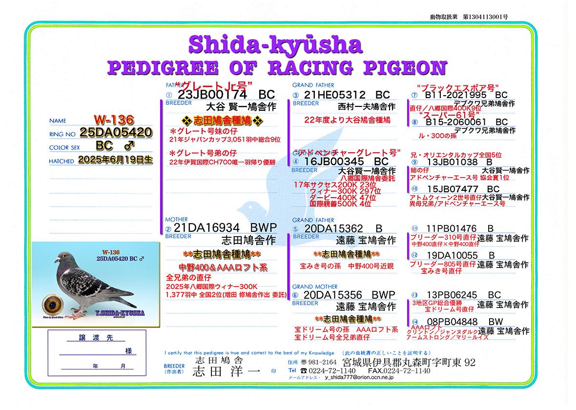 | W-136 ☆★国際鳩舎で大活躍のアドベンチャー系❎中野400・AAA系★☆ 25DA05420 BC ♂ 志田鳩舎作 国際鳩舎で活躍飛び筋の系統 2025年6月19日生 体型:中 中長距離種鳩用に作出 父.23DA00174 BC 大谷 賢一鳩舎作 志田鳩舎種鳩 従兄弟・21年ジャパンカップ 3,051羽中総合9位 従兄弟・22年伊賀国際CH 700K唯一羽帰り全国優勝 祖父.21HE05312 BC 西村一夫鳩舎作 ❝ロジャーバルセロナ号❞の孫 22年度より大谷賢一鳩舎の種鳩 曽祖父.B11-2021995 BC デブクワ兄弟鳩舎作 ❝ブラックエスポア号❞ ロジャーバルセロナ号(バルセロナN優勝 IN2位)の直仔 直仔・八郷国際 400K全国9位 曽祖母.B15-2060061 BC デブクワ兄弟鳩舎作 ❝スーパー61号❞ ル300号(ヨーストの直仔)の孫 祖母.16JB00345 BC 大谷賢一鳩舎作 ❝アドベンチャーグレート号❞ 2017年八郷国際鳩舎 国際サクセス200K全国 23位 国際ウィナー300K全国297位 国際ダービー 400K全国 47位 国際親善レース500K全国 4位 全兄弟の直仔が21年ジャパンカップ総合9位&22年伊賀国際CH700K唯一帰り全国優勝 曽祖父.13JB01038 B 大谷賢一鳩舎作 ❝07年国際CH全国4位ADプリンセス号❞の直仔 兄・13年八郷国際オリエンタルカップ700K全国5位 姉の仔・アドベンチャーエース号(14年八郷国際鳩舎 協会賞1位) 曽祖母.15JB07477 BC 大谷賢一鳩舎作 14年 八郷国際鳩舎 協会賞 アドベンチャーエース号の兄弟鳩 母.21DA16934 BWP 志田鳩舎作 志田鳩舎種鳩 中野400号・宝ドリーム号(AAA系) 全兄弟の直仔・2025年度八郷国際ウィナー300K 1,377羽中 全国2位(増田 修鳩舎委託) 祖父.20DA15362 B 遠藤 宝鳩舎作 志田鳩舎種鳩 中野400重近親種鳩 曽祖父.11PB01476 B 遠藤 宝鳩舎作 中野400直仔×中野400直娘 ブリーダー310号直仔 直仔・391号 14年地区N総合9位 15年地区N総合6位 異母兄弟・宝みき号 14年日本エースピジョン7位 (レジョナル総合31位・地区N総合3位・桜花賞総合2位) 異父兄弟・14年秋レジョナル総合優勝 18年3地区グランプリ総合優勝 曽祖母.19DA10055 B 遠藤 宝鳩舎作 ❝宝みき号❞直仔 ❝ ブリーダー805号❞(中野400直仔)×❝宝みき号❞(ブリーダー310号直仔) 異母兄弟・18年地区N総合優勝 異父兄弟・16年会長賞(レジョナル総合2位・地区N総合3位) 祖母.20DA15356 BWP 遠藤 宝鳩舎作 宝ドリーム号孫 志田鳩舎種鳩 宝ドリーム号(グランプリ3地区2,016羽中総合優勝)直仔×宝ドリーム全兄妹 曽祖父.13PB06245 BC 遠藤 宝鳩舎作 宝ドリーム号直仔 直仔・スプリント総合優勝 地区ナショナル総合4位 曽祖母.08PB04848 BW 遠藤 宝鳩舎作 宝ドリーム号全兄弟 全弟・❝宝ドリーム号❞ (3地区グランプリ総合優勝) 全弟・❝024号❞ 樋川鳩舎作 2012年伊賀国際鳩舎 500K 4位 オリエンタルカップ700K全国1位 アベレージ・協会賞2位/銘鳩賞受賞 直仔・❝龍宝号❞ 桜花賞900K総合優勝 AAA LOFT系(クリントン・ジャンヌダルク・アームストロング・マリールイズ)の孫 *Lサイズの写真1枚をサービス致します。出品鳩の所有権証は発送時に添付します。 *性別判定は、100%では有りません。*また、老鳩の場合、作出保証は有りませんので御理解の上、御入札を御願いします。 *落札後の交換・キャンセルはお受け出来ません。予めご了承下さい。 ☆★御入札の前に、当鳩舎からの発送方法の確認と自己紹介欄を御読み下さい★☆ |