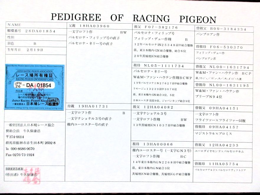 | 両親一文字ロフト作(バルセロナフィリップ号×バルセロナネリー号)×(一文字ナショナル3号×稚内ユーロスター号) B ♂ | オークションNo: 1774700190 |