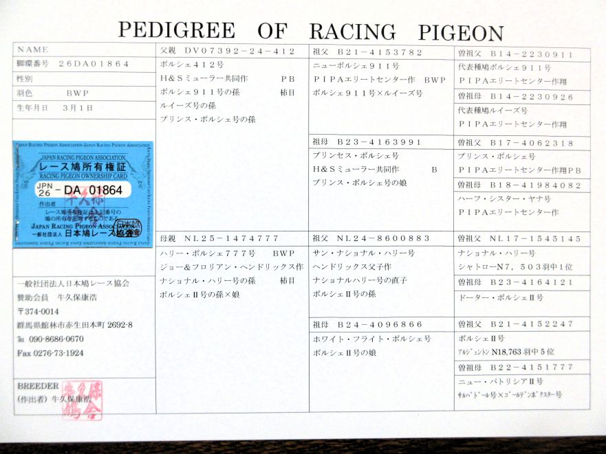 | (ポルシェ911号の直子×プリンス・ポルシェ号の娘)×(ナショナル・ハリー号の直子×ポルシェU号の娘) BWP ♂? | オークションNo: 1774755184 |