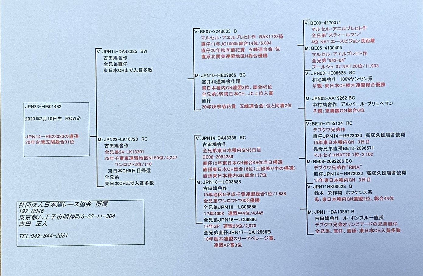 | 出品鳩の♂親の異母兄弟が、栃木地区連盟五峰連合会2020年秋季菊花賞レース1位で、異父兄弟が1位と同着の2位です。♂親方祖父は、マルセル・アエルブレヒト作のBAK17の孫で、直仔が2011年のジャパンカップで総合14位になっています。♀親の全兄弟が25年千葉東連盟地区Nのワンロフトで110羽中3位です。総合でも2780羽中150位と上位入賞し、東日本CHで5日目帰還していまます。♀親方の祖母は、19年平成千葉連盟地区N総合7位です。BE08-2092286の直系は、22年北関東地区連盟Rgで総合2位、24年北関東連盟地区Nで総合2位になっています。出品鳩の同系が千葉東連盟で21年ジャパンカップ、23年東日本CHで多数入賞し、25年も帰還しています。全国で活躍し素晴らしい成績を出しています。 |