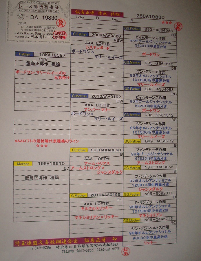 | 父親はボードワン・マリールイーの兄弟掛け。母親はアームストロング号・ジャンヌダルク号・マキシミリアン号・リッキー号。素晴らしい♀鳩にでました。詳しくは血統書をご覧ください。※即、配合出来る状態です |