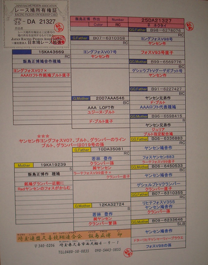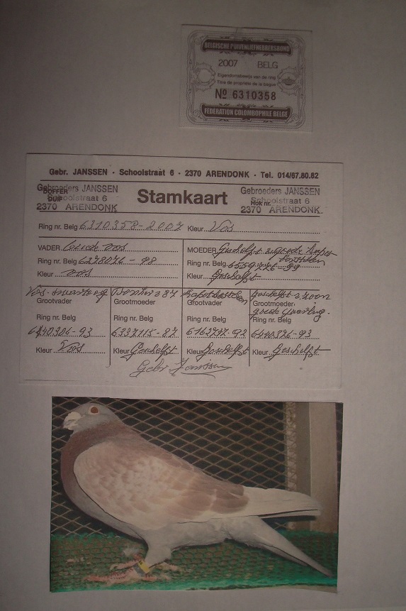 | 父親:ヤンセン作の銘鳩のヨングフォス07号×AAAロフト作のプルトとジュリアの直子です。母親:若林登鳩舎のヤンセンでグランパー号の近親にです。申し分の純ヤンセンの♀です。二枚目の写真レッドフォスV07号の写真です。詳しくは血統書をご覧ください。 |